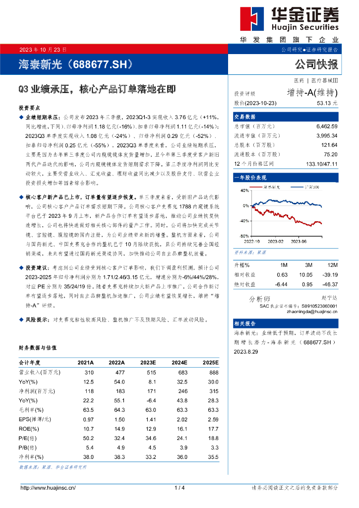 华金证券:海泰新光(688677)-Q3业绩承压,核心产品订单落地在即.pdf