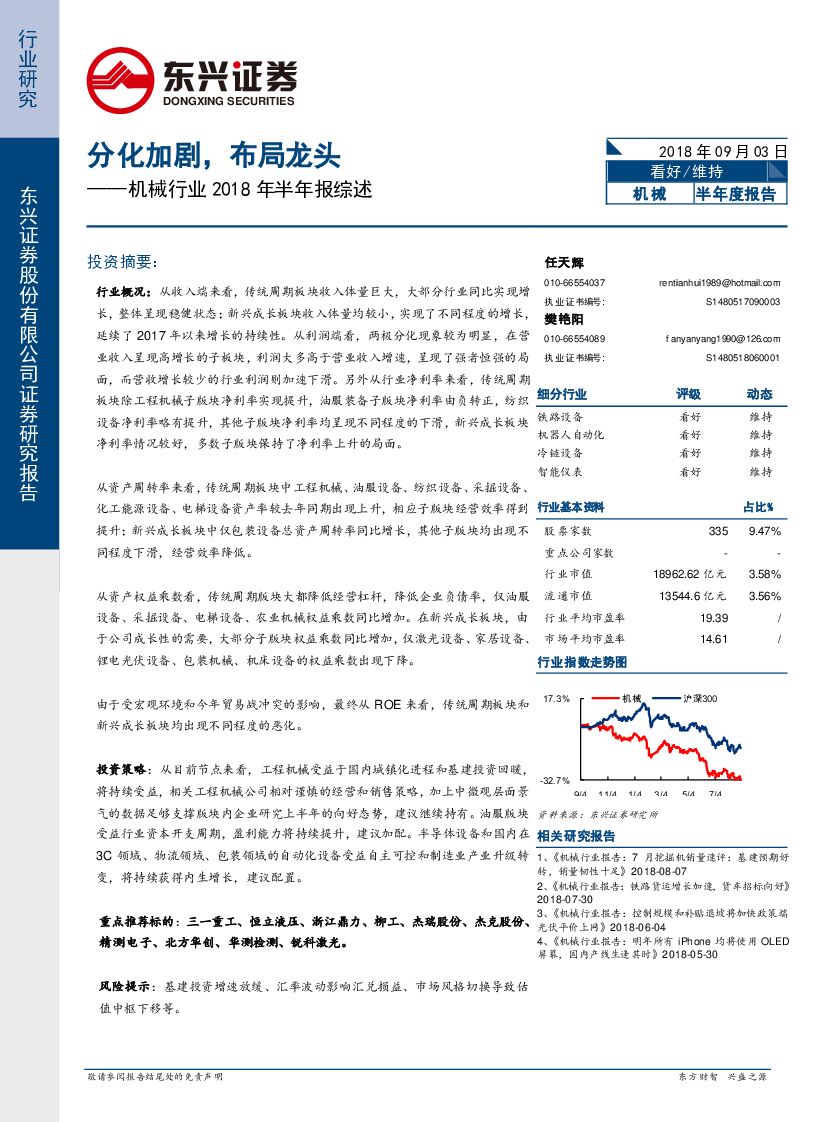 东兴证券:机械行业2018年半年报综述:分化加剧,布局龙头.pdf
