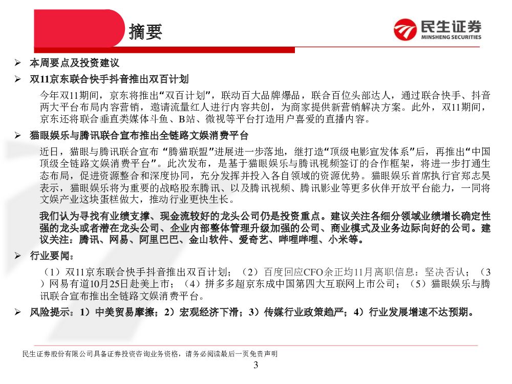 民生证券:传媒互联网行业海外周报:双11京东联合快手抖音推出双百计划,猫眼娱乐与腾讯联合宣布推出全链路文娱消费平台.pdf
