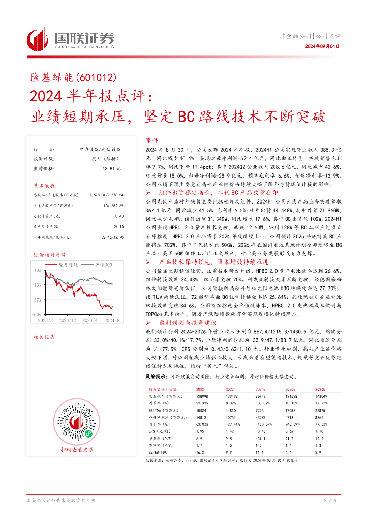 国联证券:隆基绿能(601012)-2024半年报点评:业绩短期承压,坚定BC路线技术不断突破.pdf