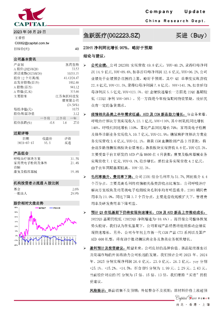 群益证券:鱼跃医疗(002223)-23H1净利同比增长90%,略好于预期.pdf