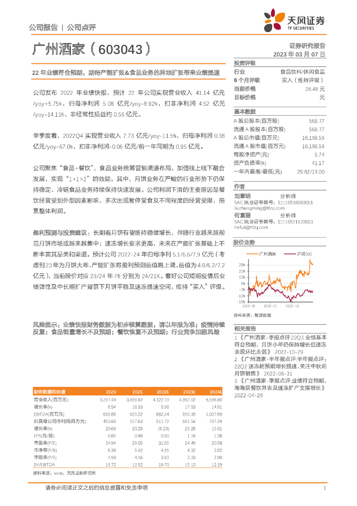 天风证券:广州酒家(603043)-22年业绩符合预期,期待产能扩张&食品业务的异地扩张带来业绩提速.pdf