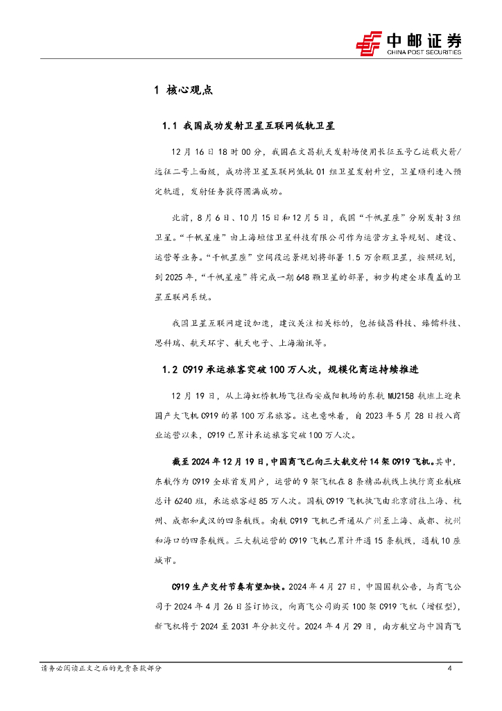 中邮证券:国防军工行业报告:我国成功发射卫星互联网低轨卫星,C919承运旅客突破100万人次.pdf