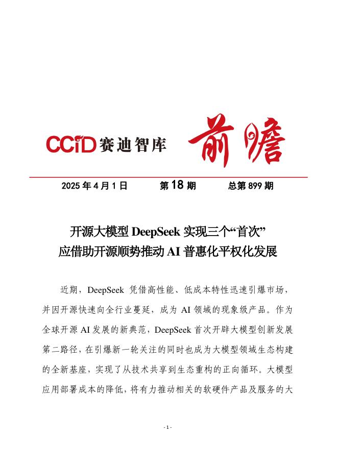 赛迪前瞻:2025年第18期(总899期):开源大模型DeepSeek实现三个“首次”,应借助开源顺势推动AI普惠化平权化发展.pdf