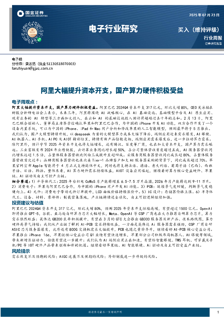 国金证券:电子行业周报:阿里大幅提升资本开支,国产算力硬件积极受益.pdf