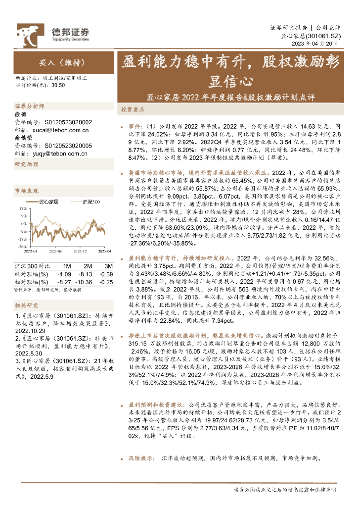 德邦证券:匠心家居2022年年度报告&股权激励计划点评:盈利能力稳中有升,股权激励彰显信心.pdf