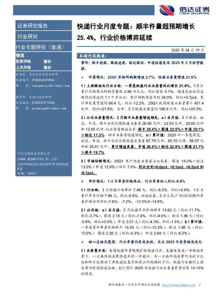 信达证券:快递行业月度专题:顺丰件量超预期增长25.4%,行业价格博弈延续.pdf