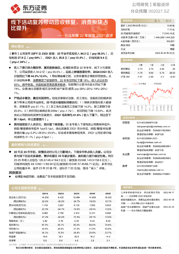 东方证券:分众传媒22年报及23Q1点评:线下活动复苏带动营收修复,消费板块占比提升.pdf