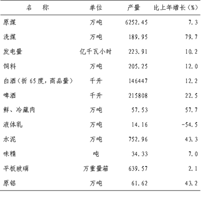在规模以上工业中,煤炭开采和洗选业增加值75.20亿元,增长19.4%;农副食品加工业增加值82.25亿元,增长26.2%;食品制造业增加值52.43亿元,增长19.8%;化学原料及化学制品制造业增加值31.17亿元,增长35.5%;医药制造业增加值10.46亿元,增长16.0%;非金属矿物制品业增加值39.83亿元,增长28.2%;有色金属冶炼及压延加工业增加值101.17亿元,增长36.5%;电力、热力的生产和供应业增加值47.39亿元,增长16.6%。