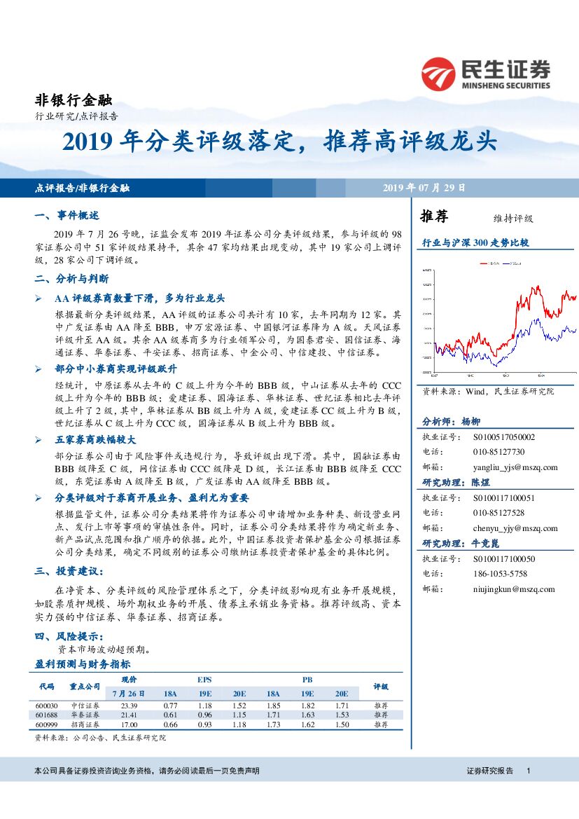 民生证券:非银行金融行业研究:2019年分类评级落定,推荐高评级龙头.pdf