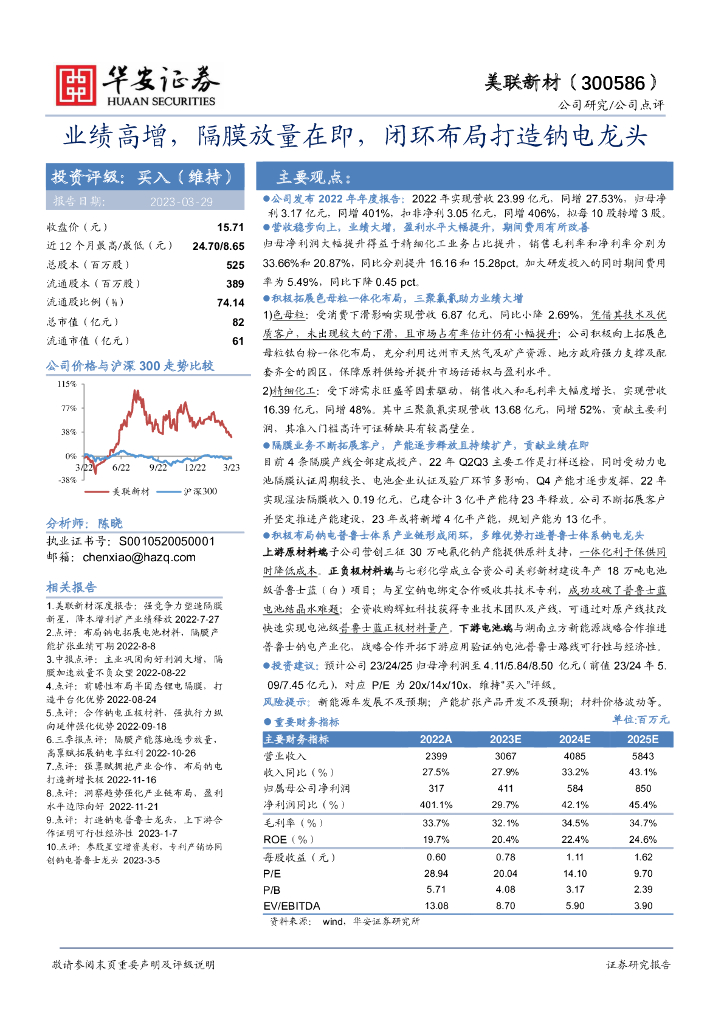 华安证券:美联新材(300586)-业绩高增,隔膜放量在即,闭环布局打造钠电龙头.pdf