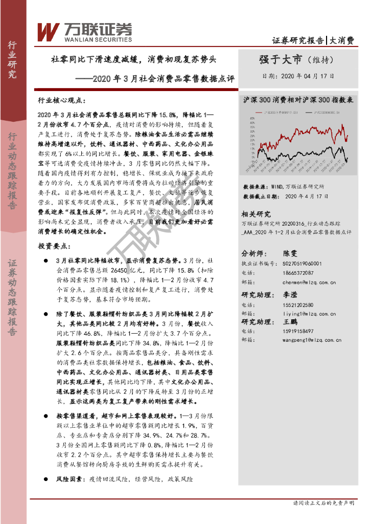 万联证券:2020年3月社会消费品零售数据点评:社零同比下滑速度减缓,消费初现复苏势头.pdf