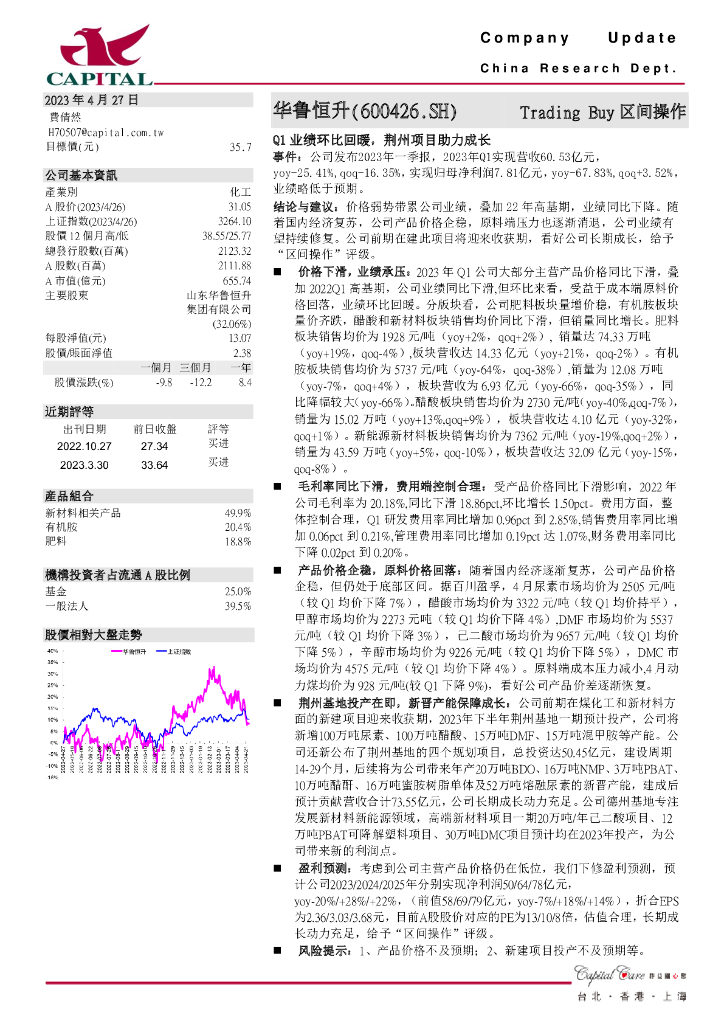 群益证券:华鲁恒升(600426)-Q1业绩环比回暖,荆州项目助力成长.pdf