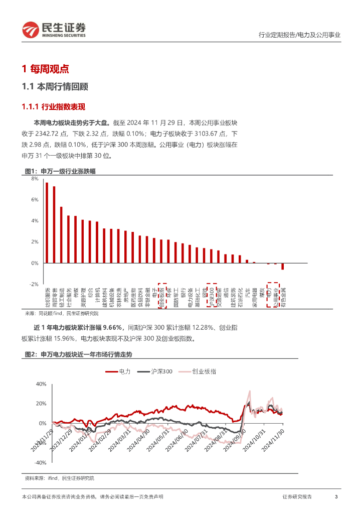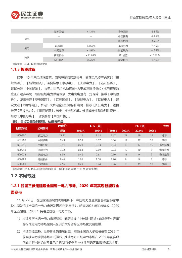 民生证券:电力及公用事业行业周报(24WK48):统一电力市场三步走,29年前新能源全面入市.pdf