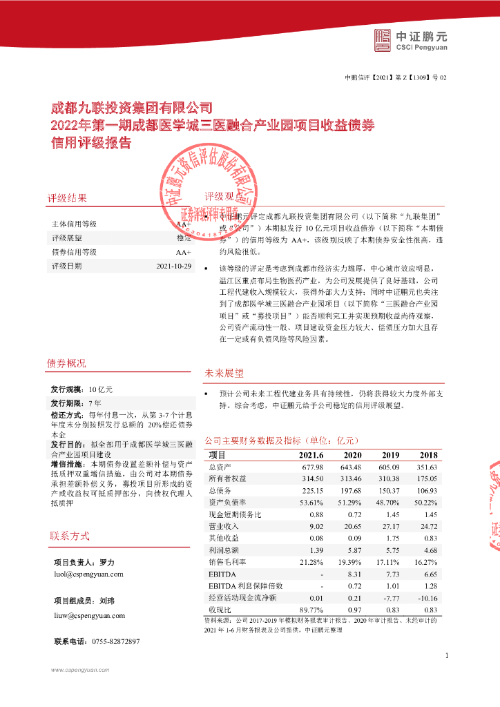 鹏元:成都九联投资集团有限公司2022年第一期成都医学城三医融合产业园项目收益债券信用评级报告.pdf