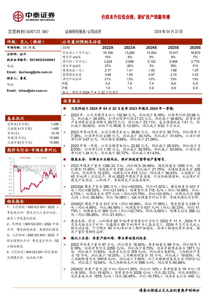中泰证券:兰花科创(600123)-价跌本升拉低业绩,新矿投产销量有增.pdf