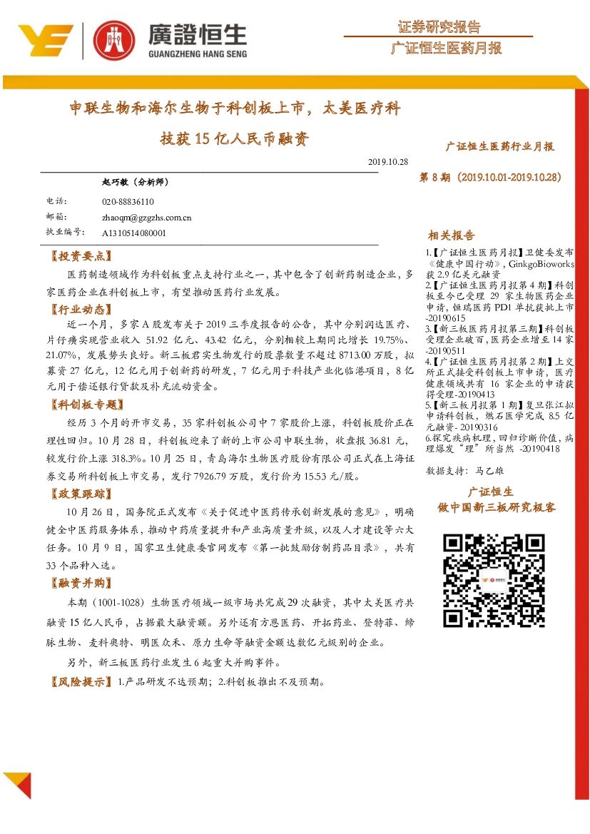 广证恒生证券研究所:医药月报:申联生物和海尔生物于科创板上市,太美医疗科技获15亿人民币融资.pdf