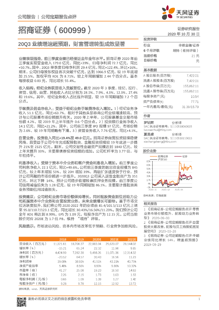天风证券:招商证券(600999)-20Q3业绩增速超预期,财富管理转型成效显著.pdf