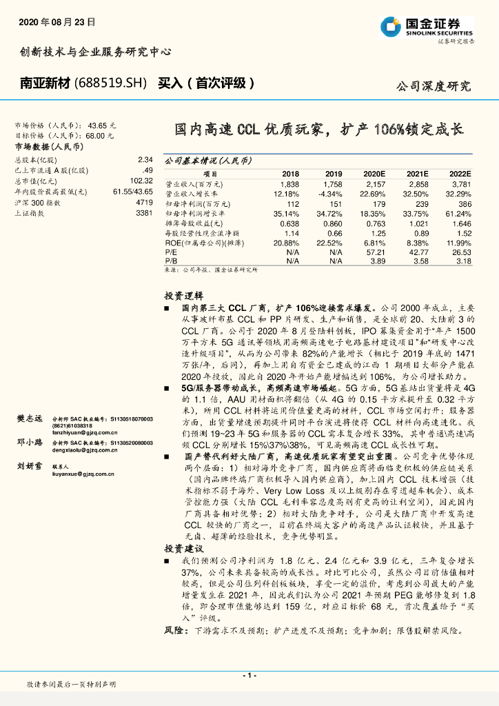 国金证券:南亚新材(688519)-国内高速CCL优质玩家,扩产106%锁定成长.pdf