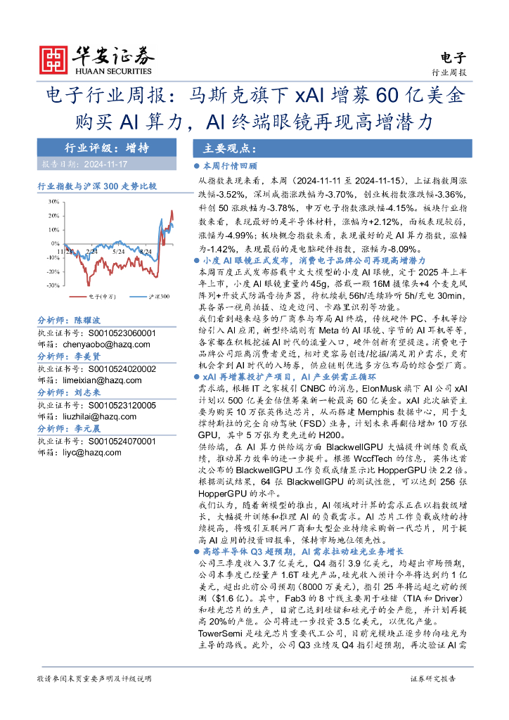 华安证券:电子行业周报:马斯克旗下xAI增募60亿美金购买AI算力,AI终端眼镜再现高增潜力.pdf