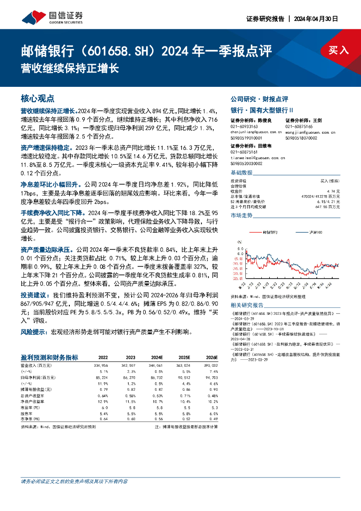 国信证券:邮储银行(601658)-2024年一季报点评:营收继续保持正增长.pdf