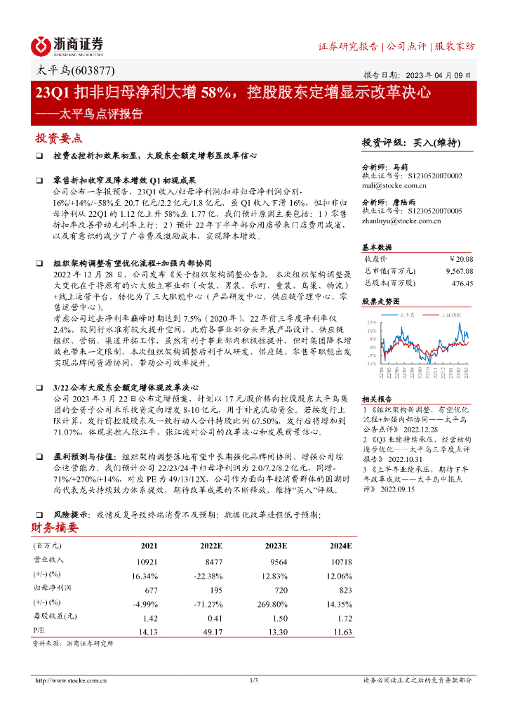 浙商证券:太平鸟点评报告:23Q1扣非归母净利大增58%,控股股东定增显示改革决心.pdf