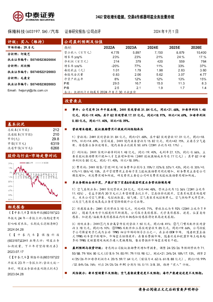 中泰证券:保隆科技(603197)-24Q2营收增长稳健,空悬&传感器明星业务放量持续.pdf