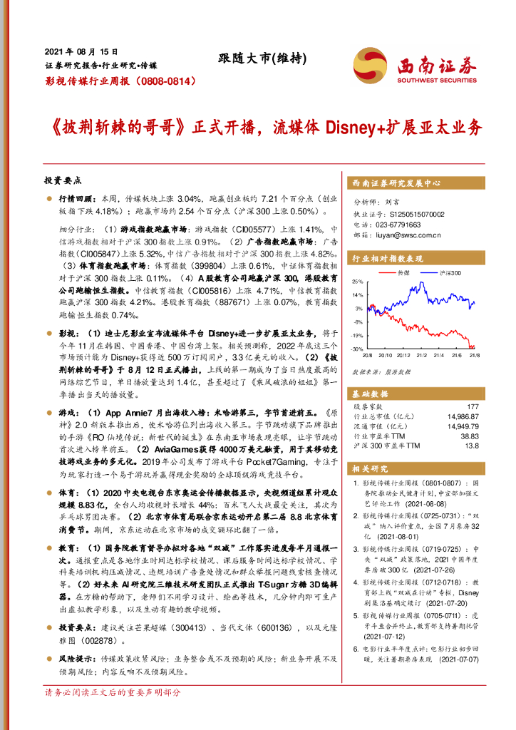 西南证券:影视传媒行业周报:《披荆斩棘的哥哥》正式开播,流媒体Disney+扩展亚太业务.pdf