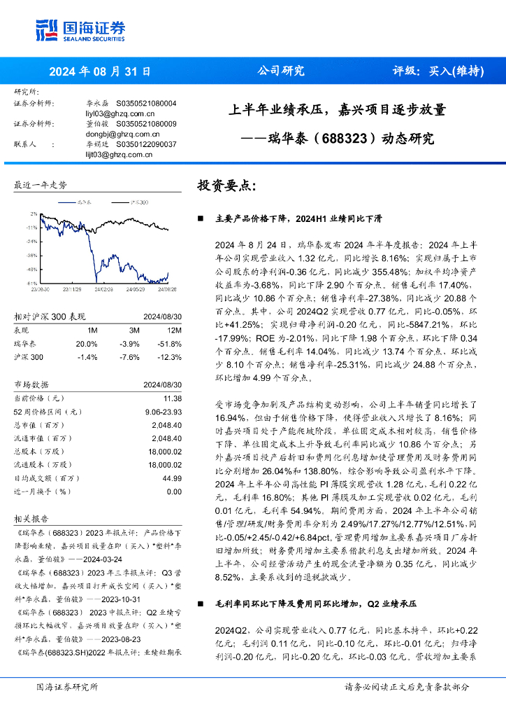 国海证券:瑞华泰(688323)-上半年业绩承压,嘉兴项目逐步放量.pdf
