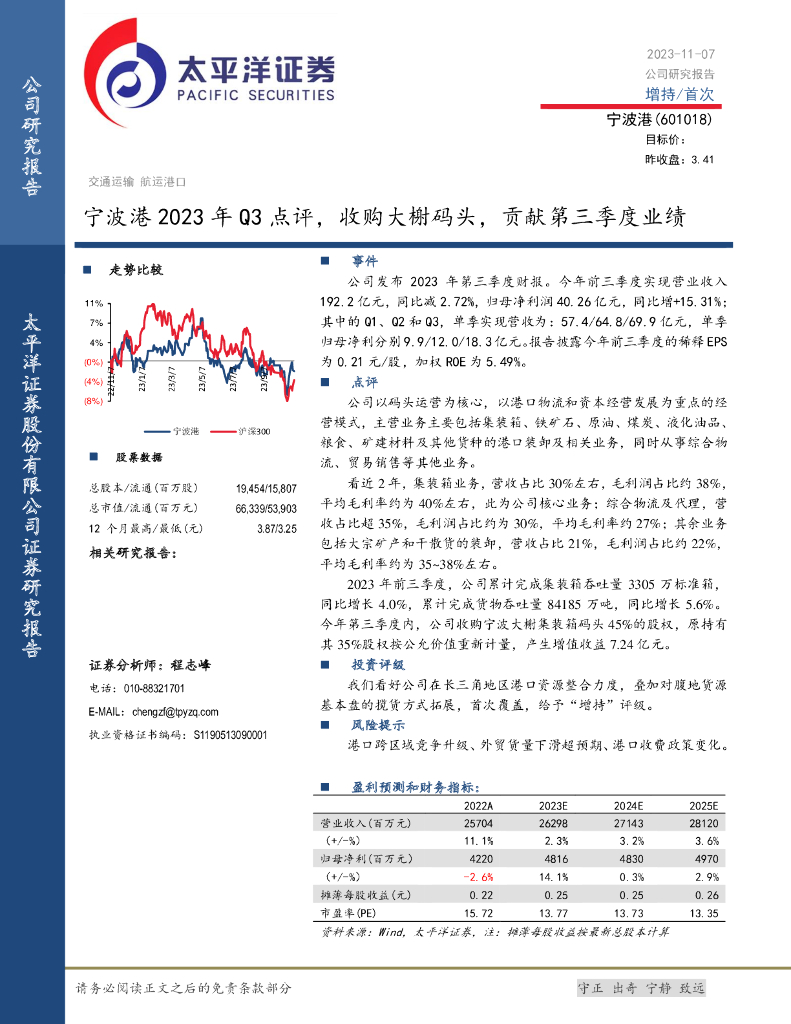 太平洋证券:宁波港(601018)-2023年Q3点评,收购大榭码头,贡献第三季度业绩.pdf