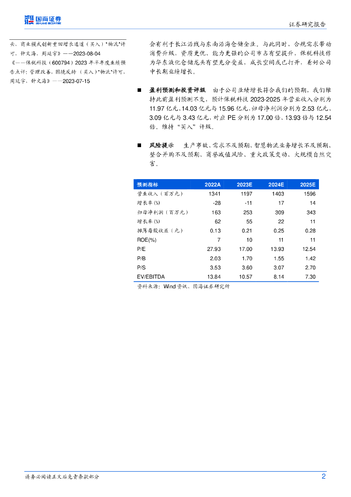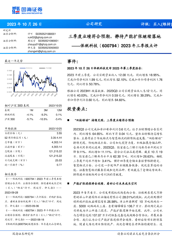 国海证券:保税科技(600794)-2023年三季报点评:三季度业绩符合预期,静待产能扩张继续落地.pdf