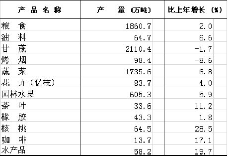 全年粮食总产量[3]达1860.7万吨,比上年增长2.0%。油料产量64.7万吨,增长6.6%;烤烟产量98.3万吨,下降8.6%;蔬菜产量1735.6万吨,增长6.8%;园林水果产量605.3万吨,增长5.9%;茶叶产量33.6万吨,增长11.2%;鲜切花产量83.7亿枝,增长4.0%。