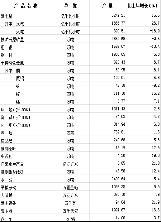 全年规模以上粗钢产量1689.07万吨,下降10.4%;钢材产量1935.05万吨,下降5.8%;十种有色金属产量320.43万吨,增长6.7%;水泥产量9492.64万吨,增长5.4%;卷烟产量769.61万箱,增长1.6%;成品糖产量249.68万吨,增长5.6%。