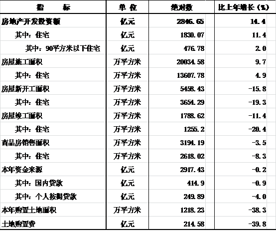 全年房地产开发投资达2846.65亿元,比上年增长14.4%,其中,商品住宅投资1830.07亿元,增长11.4%;办公楼投资133.78亿元,增长13.9%;商业营业用房投资533.14亿元,增长29.7%。2014年,全省商品房施工面积20034.58万平方米,比上年增长9.7%;商品房屋竣工面积1788.62万平方米,下降11.4%;商品房销售面积3194.19万平方米,下降3.5%;商品房销售额1596.37亿元,增长7.3%。