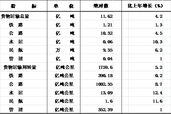 全年货物运输总量11.62亿吨,比上年增长4.2%。货物运输周转量1759.60亿吨公里,增长5.2%。