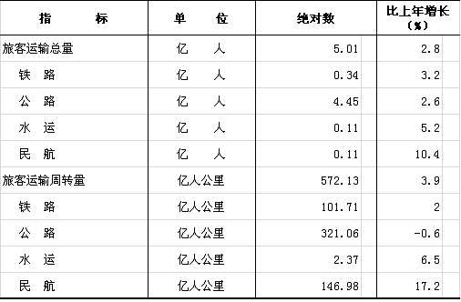 全年旅客运输总量5.01亿人次,比上年增长2.8%。旅客运输周转量572.13亿人公里,增长3.9%。