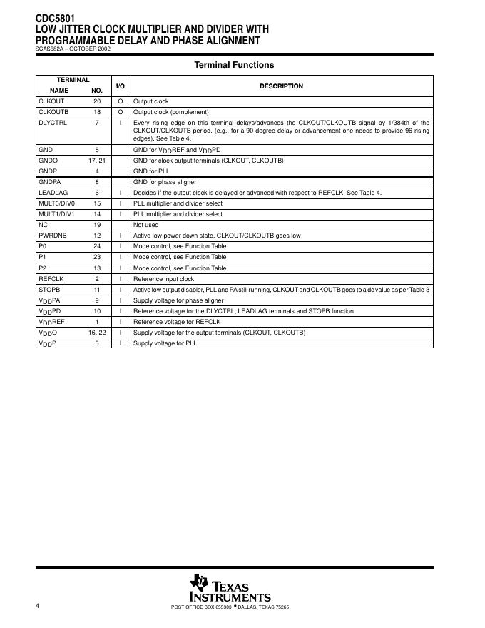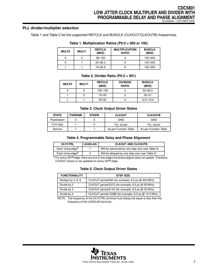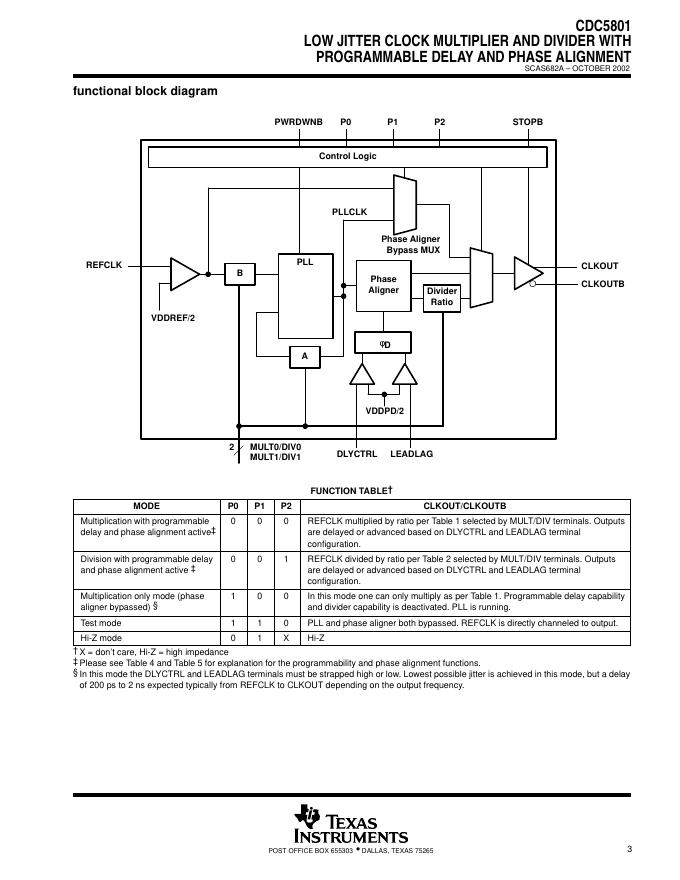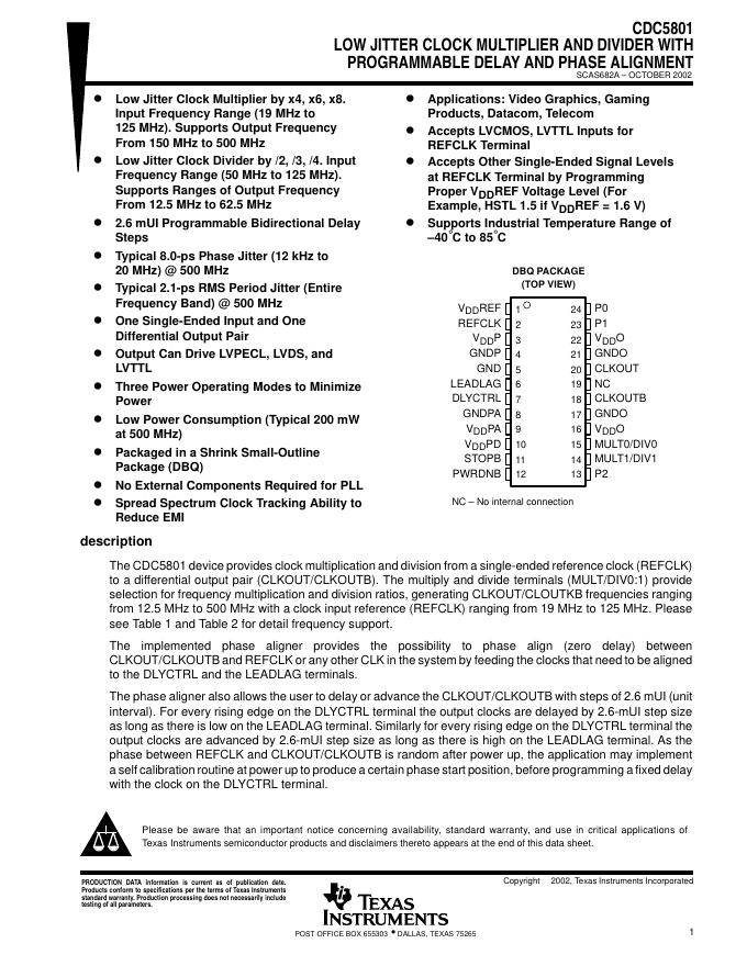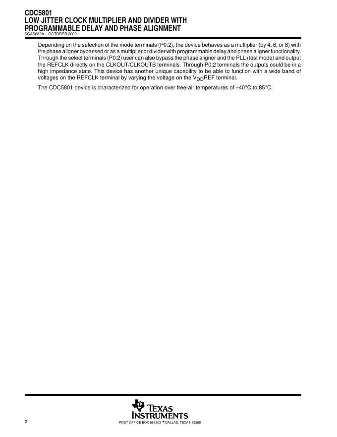 TEXAS INSTRUMENTS CDC5801 LOW JITTER CLOCK MULTIPLIER AND DIVIDER WITH PROGRAMMABLE DELAY AND PHASE ALIGNMENT 数据手册.pdf