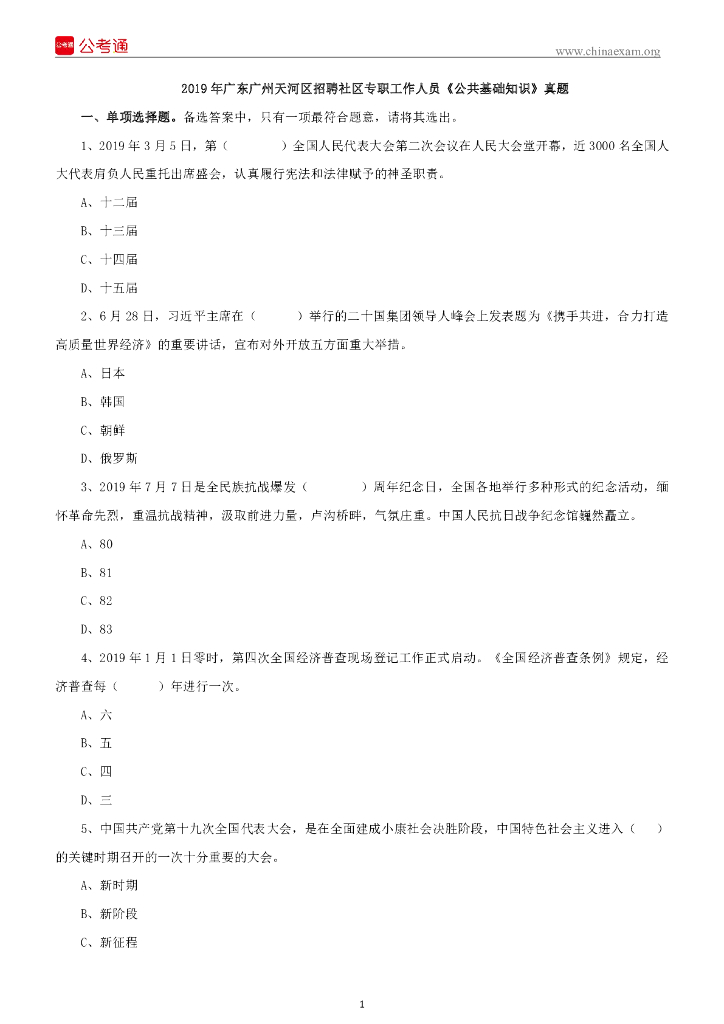 2019年广东广州天河区招聘社区专职工作人员《公共基础知识》真题.pdf