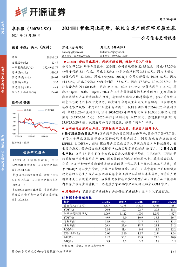 开源证券:卓胜微(300782)-公司信息更新报告:2024H1营收同比高增,依托自建产线筑牢发展之基.pdf
