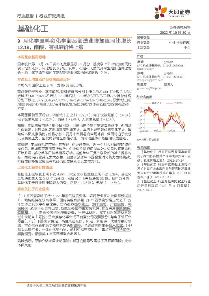 天风证券:基础化工行业研究周报:9月化学原料和化学制品制造业增加值同比增长12.1%,醋酸、有机硅价格上涨.pdf