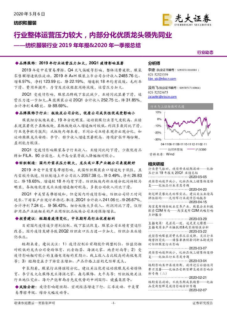 光大证券:纺织服装行业2019年年报&2020年一季报总结:行业整体运营压力较大,内部分化优质龙头领先同业.pdf