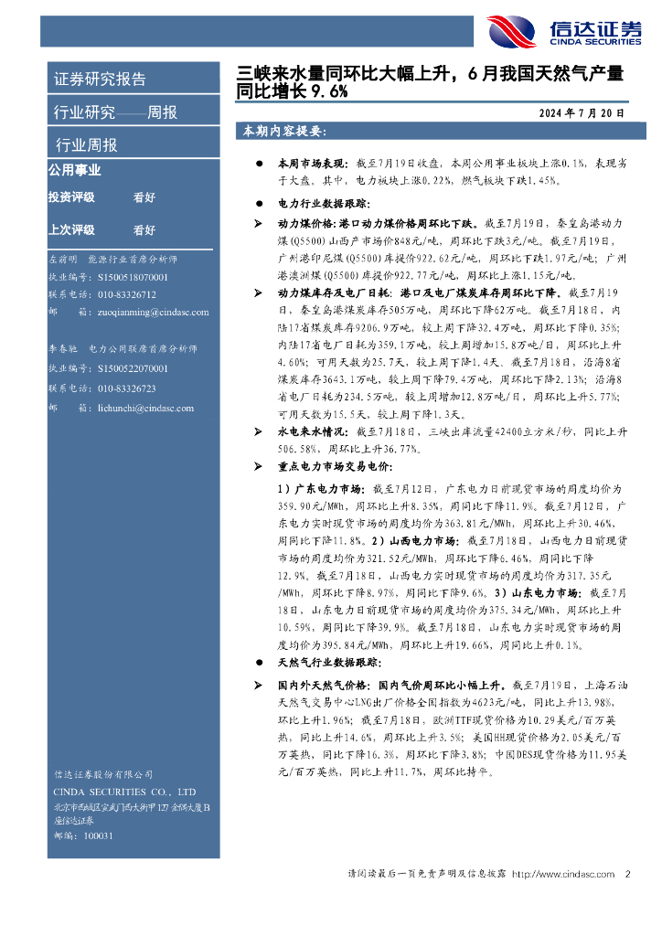 信达证券:公用事业—电力天然气周报:三峡来水量同环比大幅上升,6月我国天然气产量同比增长9.6%.pdf