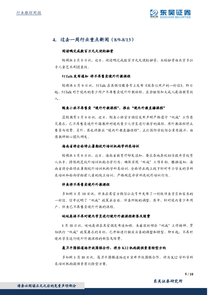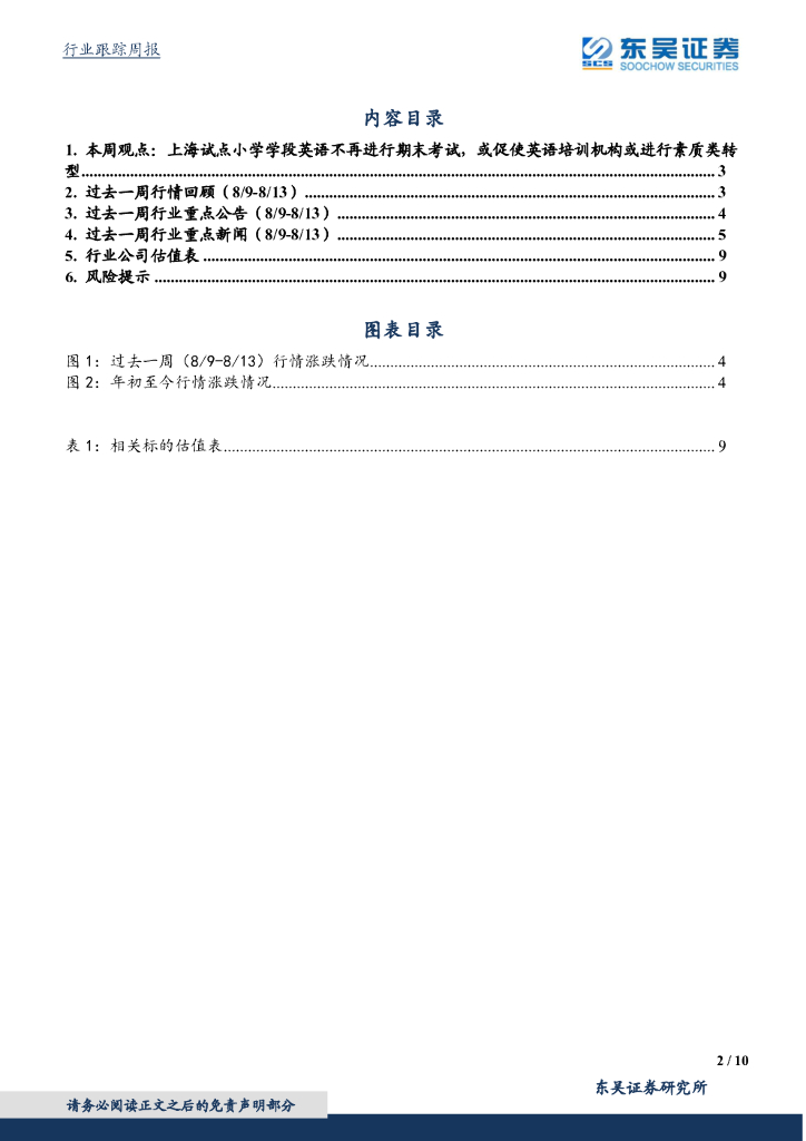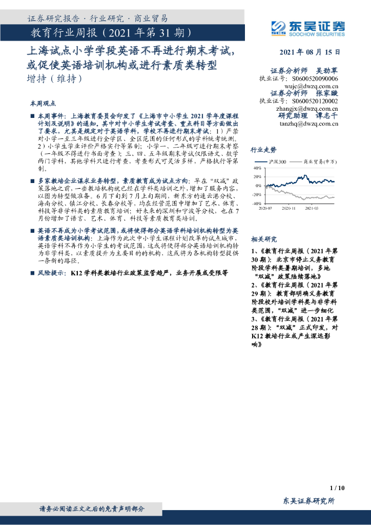东吴证券:教育行业周报(2021年第31期):上海试点小学学段英语不再进行期末考试,或促使英语培训机构或进行素质类转型.pdf