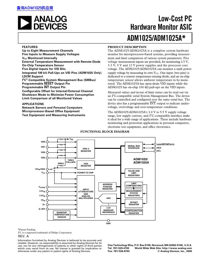 ANALOG DEVICES ADM1025/ADM1025A* Low-Cost PC Hardware Monitor ASIC 数据手册.pdf
