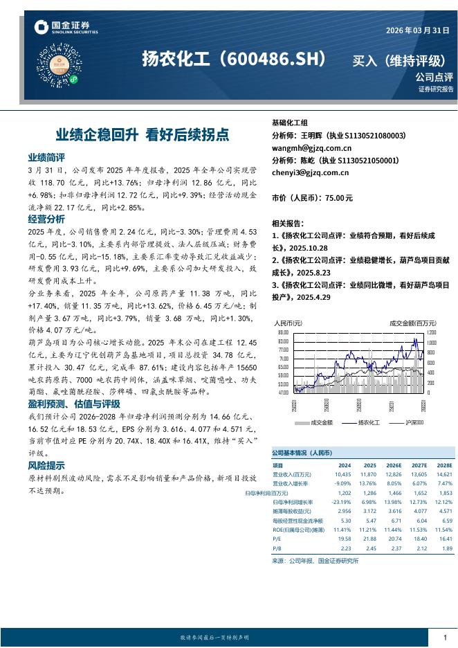 国金证券:扬农化工(600486)-业绩企稳回升,看好后续拐点.pdf