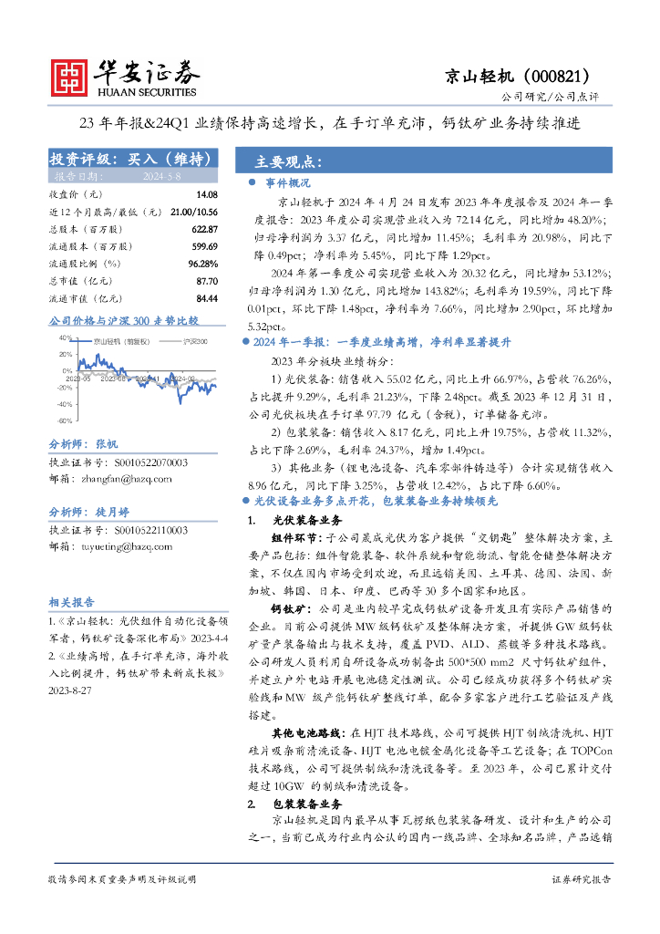 华安证券:京山轻机(000821)-23年年报&24Q1业绩保持高速增长,在手订单充沛,钙钛矿业务持续推进.pdf