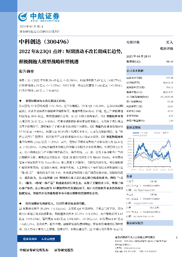 中航证券:中科创达(300496)-2022年&23Q1点评:短期波动不改长期成长趋势,积极拥抱大模型战略转型机遇.pdf