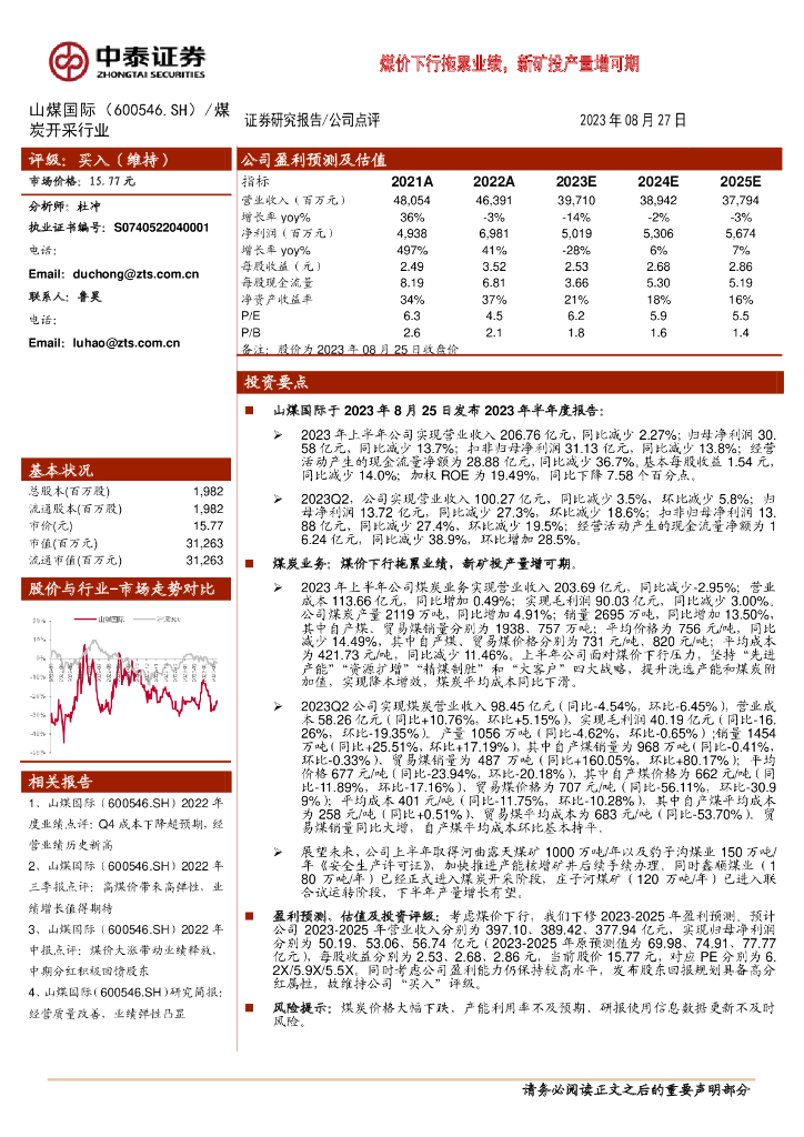 中泰证券:山煤国际(600546)-煤价下行拖累业绩,新矿投产量增可期.pdf