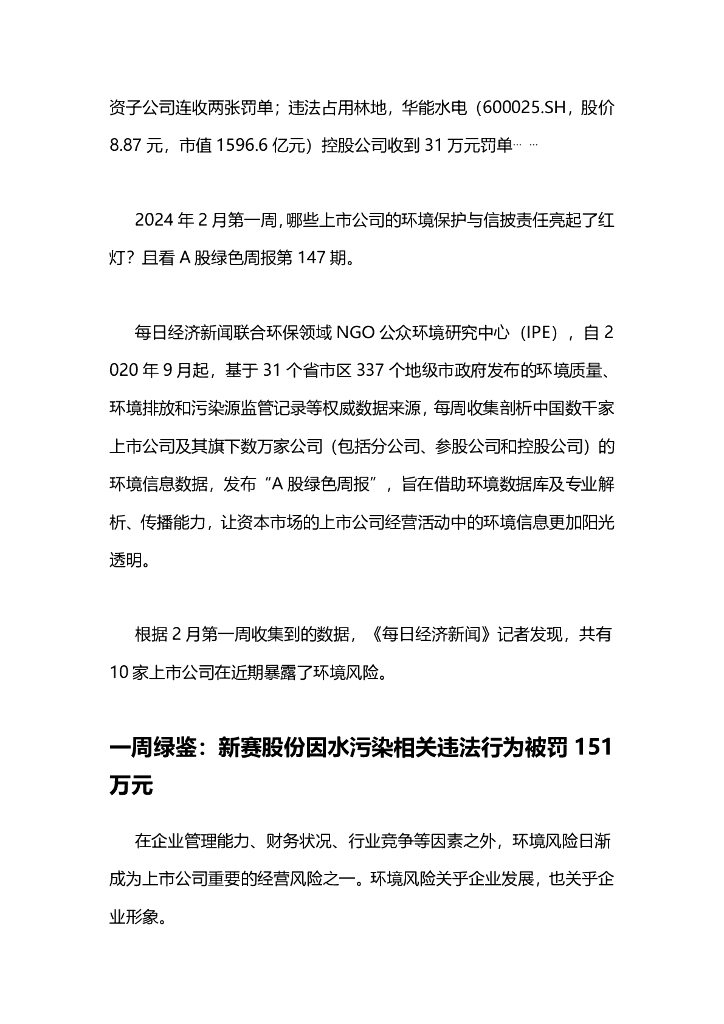 A股绿色周报(2024年2月第一周):10家上市公司暴露环境风险 新赛股份全资子公司被罚151万元.pdf