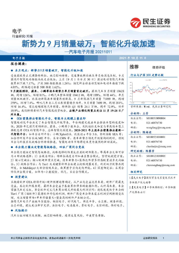 民生证券:汽车电子月报:新势力9月销量破万,智能化升级加速.pdf